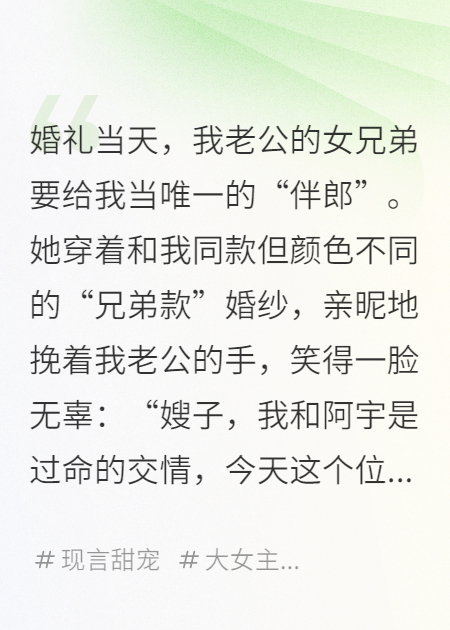 主角为【周宇白月乔乐】的现言甜宠,大女主,爽文,逆袭小说《婚礼现场,我和闺蜜团把渣男绿茶一锅端了》,由作家“文文九九”倾心创作,情节充满惊喜与悬念。本站无广告,欢迎阅读!本书共计10493字,1章节,更新日期为2025-11-17。该作品目前在本网 【sosoxx.com】上完结。小说详情介绍:婚礼现场,我和闺蜜团把渣男绿茶一锅端了