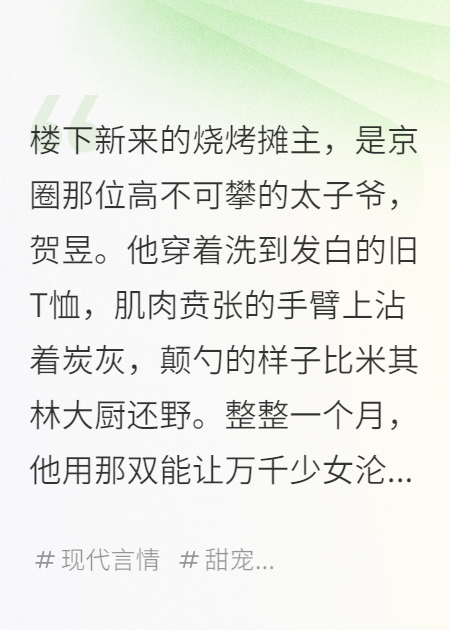 男女主角分别是【贺昱】的现代言情,甜宠,逆袭,沙雕搞笑小说《重生后,冷情霸总为我烤串一个月》,由网络作家“金蛇郎君夏雪宜”倾情创作,描绘了一段动人心弦的爱情故事,本站无广告干扰,精彩内容欢迎阅读!本书共计12048字,1章节,更新日期为2025-11-17。该作品目前在本网 【sosoxx.com】上完结。小说详情介绍:重生后,冷情霸总为我烤串一个月